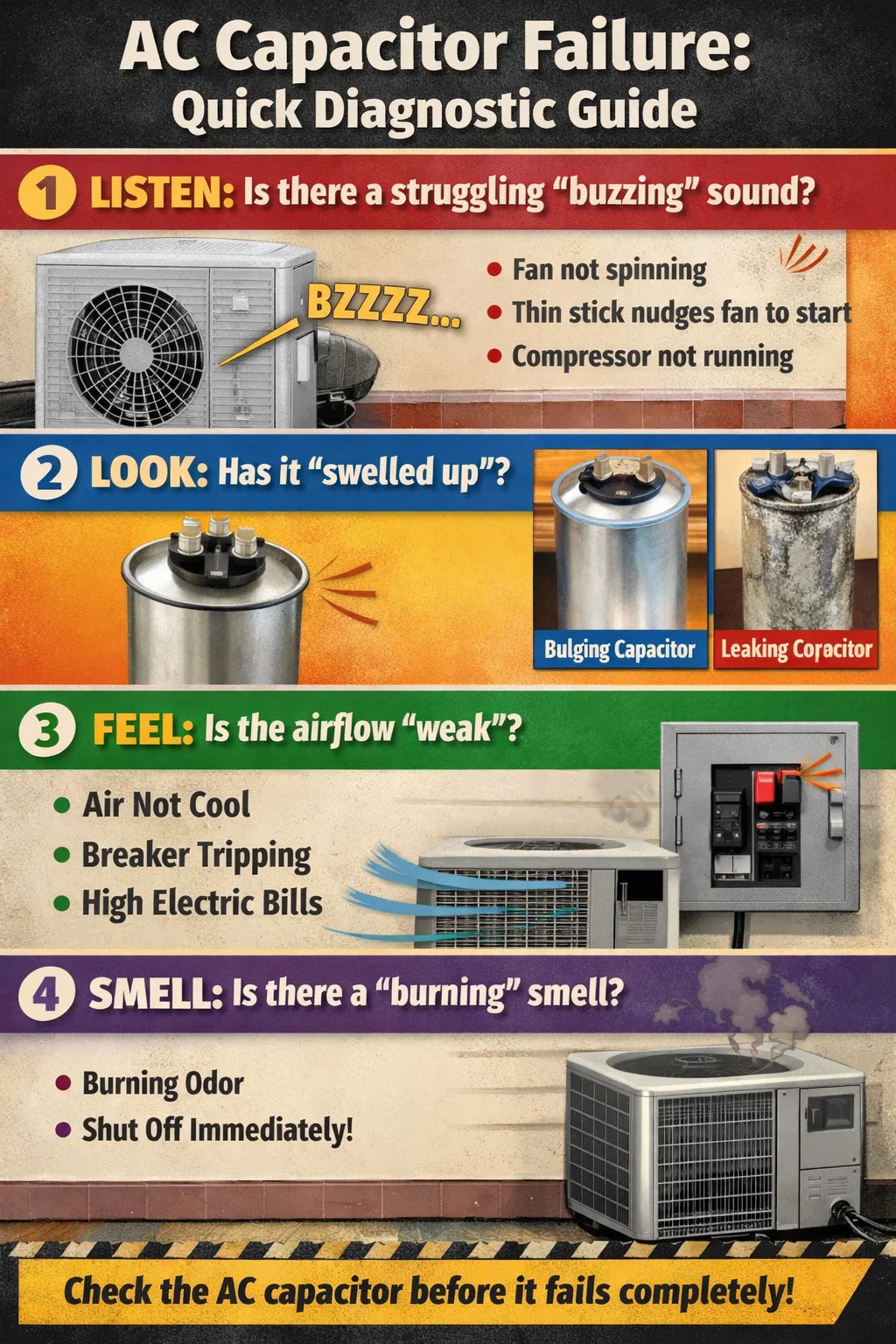 When your air conditioner starts acting up, the AC capacitor is often the easiest part to fail and also the easiest to diagnose. You don't need to disassemble complex circuitry; you can roughly determine if it needs replacing using these simple methods:
