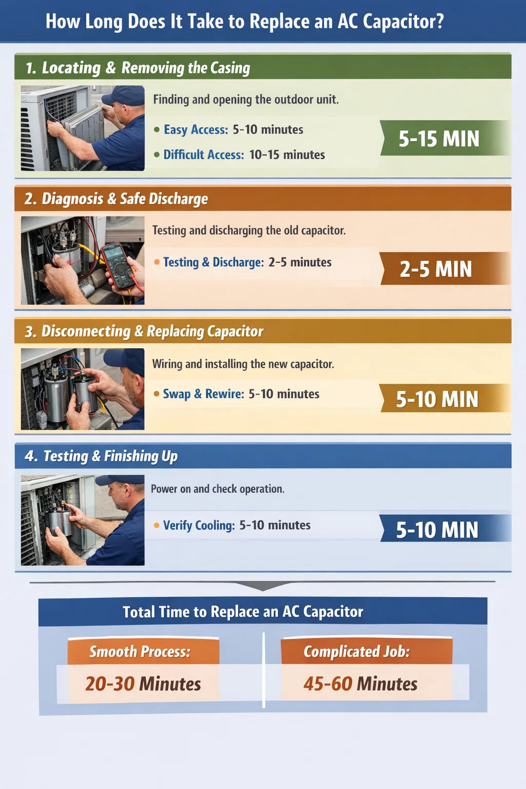 How long does it actually take to replace an AC capacitor? If you only watch the few minutes the technician is working, you might think the job is surprisingly quick. But from the moment the technician arrives until the air conditioner is blowing cold air again, there's a complete process involved.