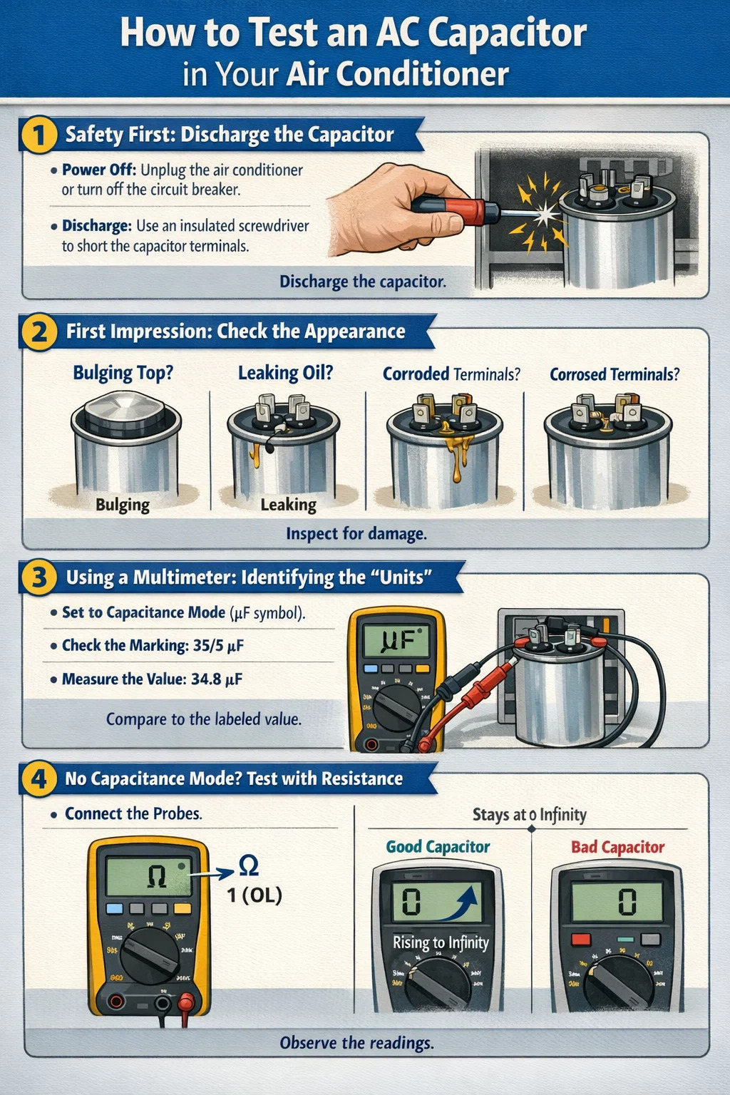This step is the most important before you start testing. An AC capacitor is like a battery; even after the power is off, it may still hold a high-voltage charge, and touching it directly could result in a severe electric shock.
