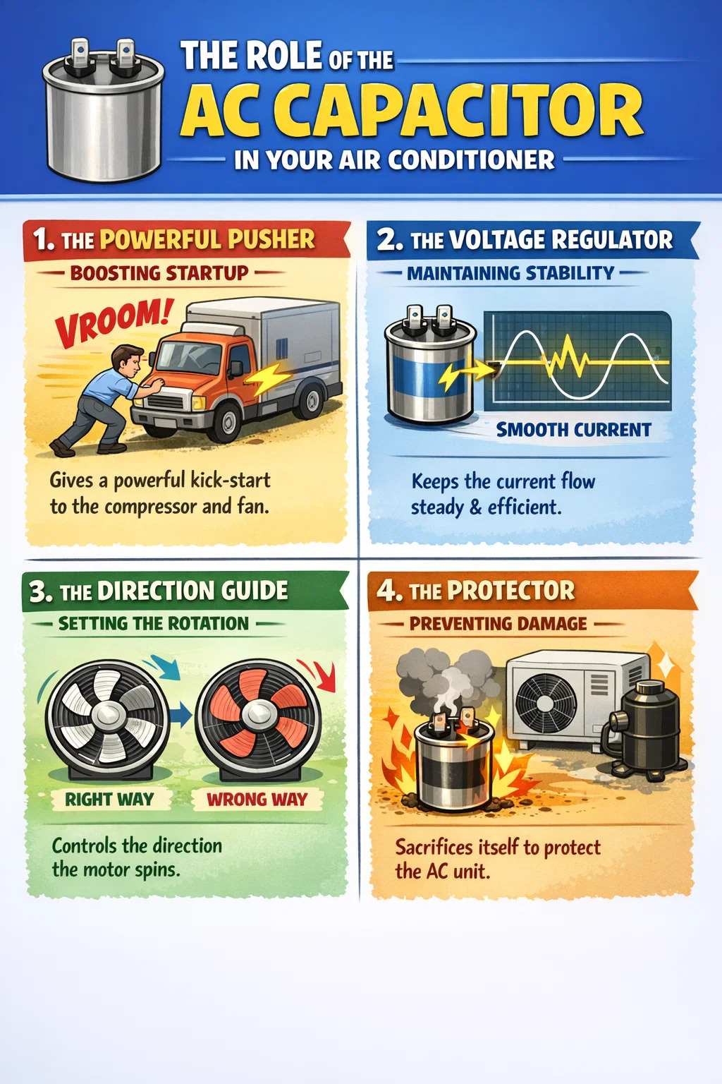 After the air conditioner starts running smoothly, it doesn't completely rest. At this point, its role changes to that of a run capacitor.