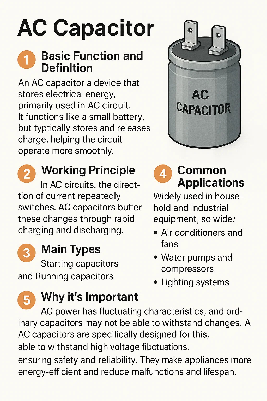 An AC capacitor is an electronic component used in alternating current (AC) systems, specifically designed for handling AC power. Below is a breakdown of its key aspects, explained in simple terms.